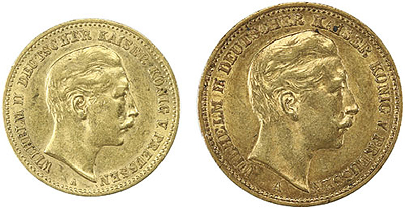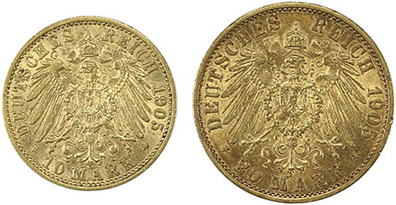 German States. Prussia. Wilhelm II (1888-1918). Pair. 10 and 20 Mark, 1905 A. Head r., rev. Imperial eagle. KM 520, 521. The latter toned, Extremely Fine. (2)