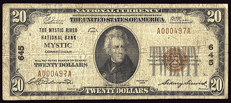 CT. Mystic. Ch.645. Mystic River National Bank. $20. 1929 T1. Fr. 1802-1. No.A000497A. Plate A. Fine.