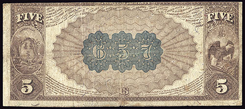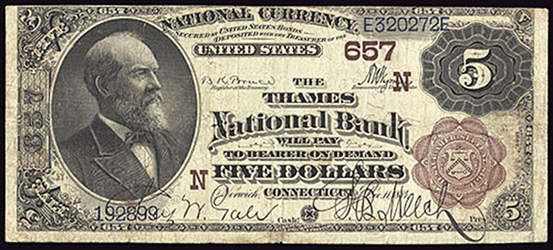 CT. Norwich. Ch.N657. Thames National Bank. $5. 1882 BB. Fr. 467. No.192899/E320272E. Plate N. Fine. Trimmed into top border.