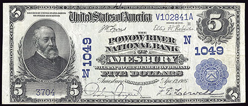 MA. Amesbury. Ch.N1049. Powow River National Bank of Amesbury. $5. 1902 DB. Fr. 590. No.3704/V102841A. Plate H. VF. Some very light soiling on the back.