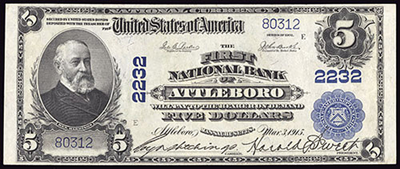 MA. Attleboro. Ch.2232. First National Bank of Attleboro. $5. 1902 PB. Fr. 605. No.80312. Plate E. AU. Near the top of the census for $5 Plain Backs issued by this Bristol County bank.