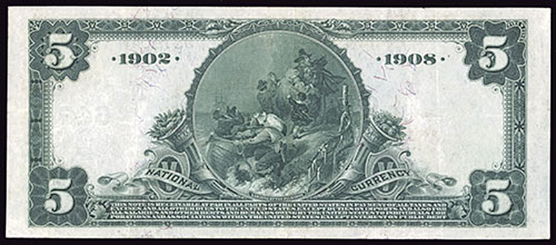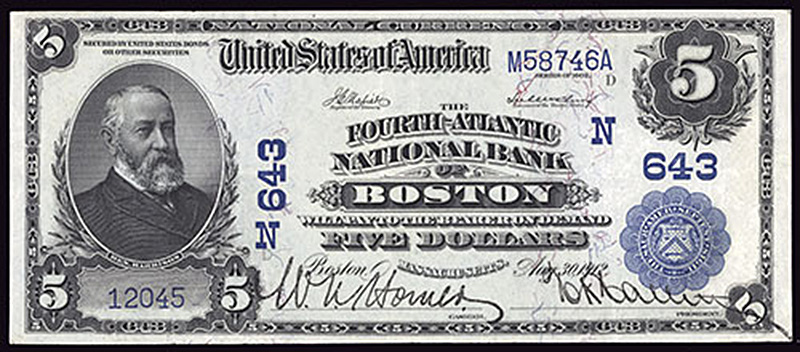 MA. Boston. Ch.N643. Fourth-Atlantic National Bank of Boston. $5. 1902 DB. Fr. 594. No.M58746A. Plate D. EF. Perfectly centered, and it appears to be Uncirculated at first glance.