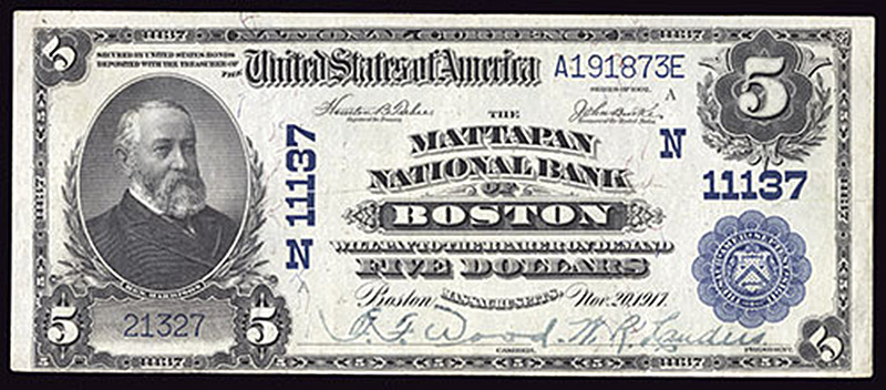 MA. Boston. Ch.N11137. Mattapan National Bank of Boston. $5. 1902 PB. Fr. 606. No.21327/A191873E. Plate A. VF-EF.