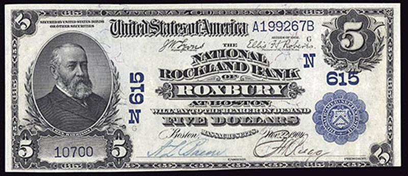 MA. Roxbury. Ch.N615. National Rockland Bank of Roxbury. $5. 1902 DB. Fr. 590. No.10700/A199267B. Plate G. EF-AU. Only one other $5 Date Back on this second title is known, and it is only a VG.
