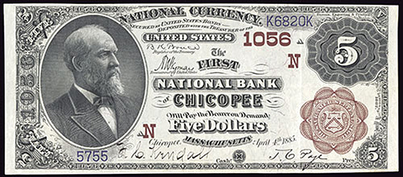 MA. Chicopee. Ch.N1056. First National Bank of Chicopee. $5. 1882 BB. Fr. 467. No.5755/K6820K. Plate A. VF-EF, and at first glance appears to be Uncirculated.