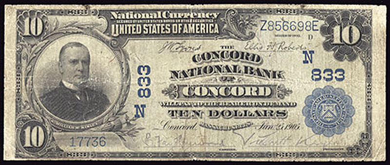 MA. Concord. Ch.N833. Concord National Bank of Concord. $10. 1902 PB. Fr. 624. No.17736/Z856698E. Plate D. About Fine, with two stains in the top margin.