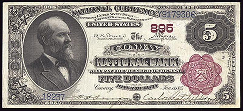 MA. Conway. Ch.895. Conway National Bank. $5. 1882 BB. Fr. 467. No.18237/Y917930. Plate F. EF. A very compelling title layout adds to the eye appeal of this lovely $5 Brown Brown back. The margins are generous, and the centering is quite decent. The lower right corner tip may have been professionally repaired, but design elements of the note are not involved.
