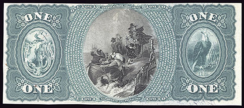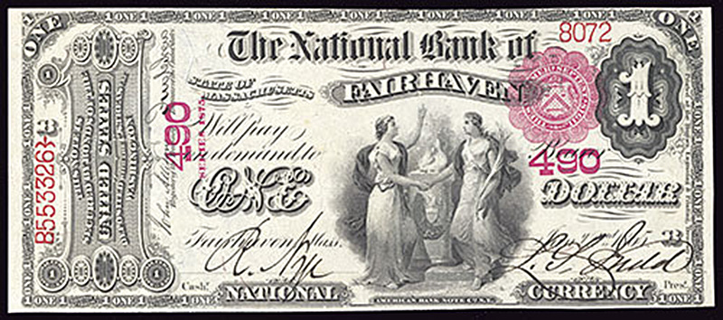 MA. Fairhaven. Ch.490. National Bank of Fairhaven. $1. 1875. Fr. 383. No.8072/B553326. Plate B. Uncirculated. The top and bottom margins are narrow. The brilliant red seal and serial numbers, vibrant green back, and the excellent paper quality combine to make this note very attractive.