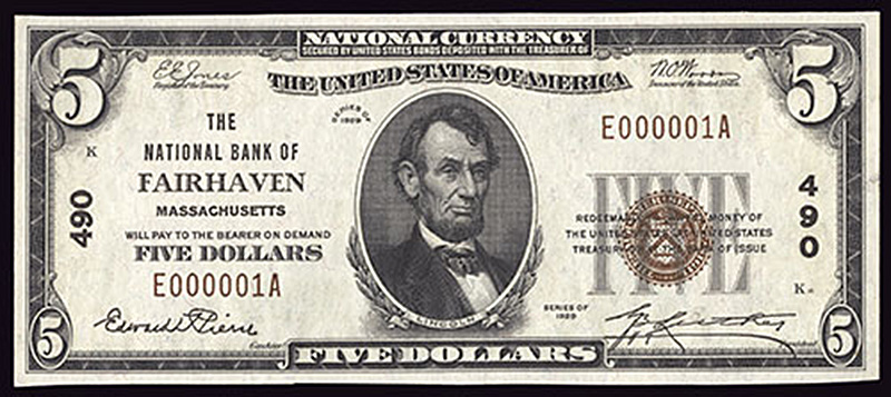 MA. Fairhaven. Ch.490. National Bank of Fairhaven. $5. 1929 T1. Fr. 1800-1. No.E000001A. Plate K. Uncirculated. This is only the third serial number 1 $5 1929 note from this bank to appear at auction since 1992.