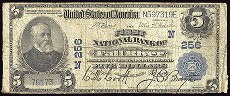 MA. Fall River. Ch.N256. First National Bank of Fall River. $5. 1902 PB. Fr. 598. No.76173/N597319E. Plate l. VG-Fine detail, but some repairs have been made to the edges.