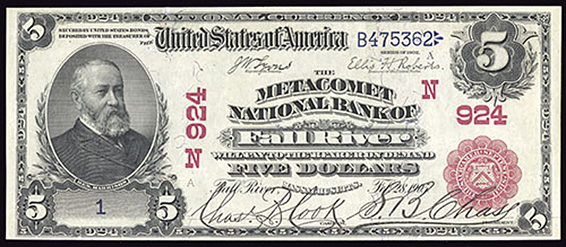 MA. Fall River. Ch.N924. Metacomet National Bank of Fall River. $5. 1902 RS. Fr. 587. No.1/B475362. Plate A. Uncirculated. Vivid red seal and charter numbers, and excellent paper quality.
