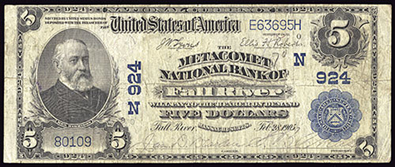 MA. Fall River. Ch.N924. Metacomet National Bank of Fall River. $5. 1902 PB. Fr. 598. No.80109/E63695H. Plate O. Fine.