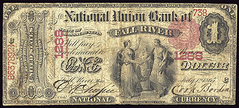 MA. Fall River. Ch.1288. National Union Bank of Fall River. $1. 1875. Fr. 386. No.738/B637892. Plate C. About Fine. Trimmed right to the borders.