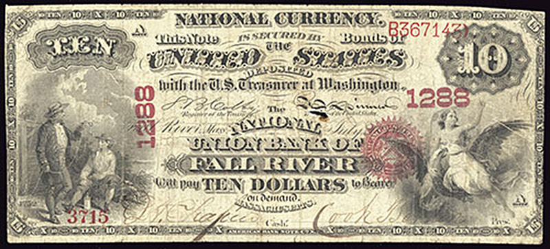 MA. Fall River. Ch.1288. National Union Bank of Fall River. $10. 1865 Original Series. Fr. 412a. No.3715/B367143. Plate A. Fine details. Body hole and pinholes.