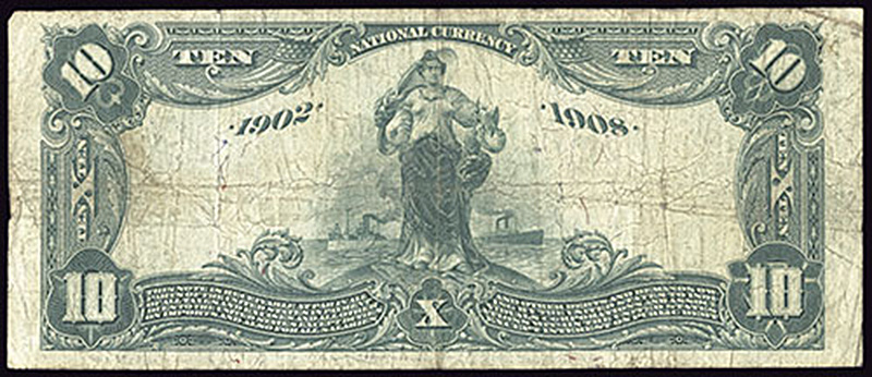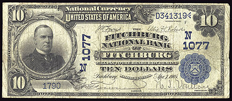 MA. Fitchburg. Ch.N1077. Fitchburg National Bank of Fitchburg. $10. 1902 DB. Fr. 616. No.1790/D341319. Plate F. Fine. Only eleven large size notes are reported on this bank.