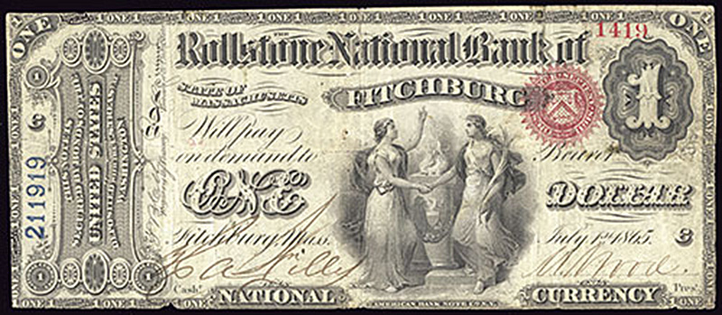 MA. Fitchburg. Ch.(702). Rollstone National Bank of Fitchburg. $1. 1865 Original Series. Fr. 380. Blue serial numbers. No.1419/211919. Plate C. VF detail, trimmed just into the borders.