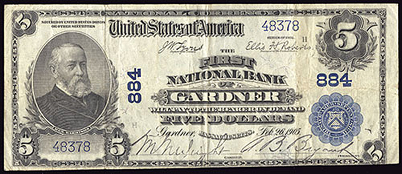 MA. Gardner. Ch.884. First National Bank of Gardner. $5. 1902 PB. Fr. 598. No.48378. Plate H. VF.