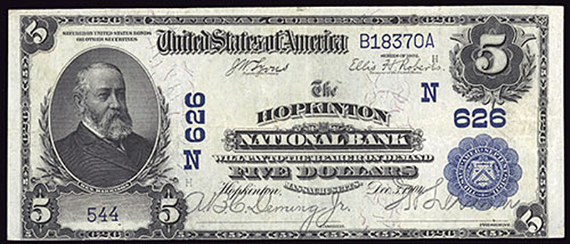 MA. Hopkinton. Ch.N626. Hopkinton National Bank. $5. 1902 DB. Fr. 590. No.544/B18370A. Plate H. VF, with the overall appearance of a higher grade.