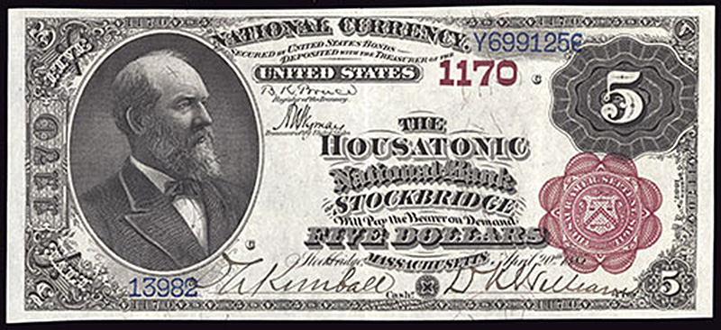 MA. Stockbridge. Ch.1170. Housatonic National Bank of Stockbridge. $5. 1882 BB. Fr. 467. No.13982/Y699125. Plate C. EF-AU. At first glance this example has the appearance of an Uncirculated note. Fresh, crisp, and loaded with eye appeal.