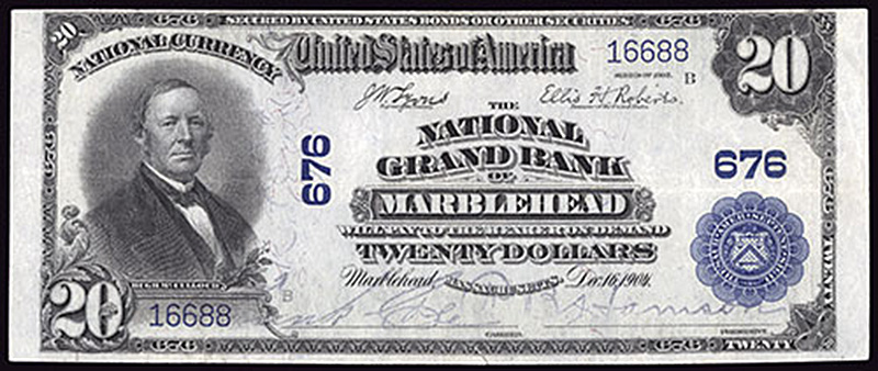 MA. Marblehead. Ch.676. National Grand Bank of Marblehead. $20. 1902 PB. Fr. 650. No.16688. Plate B. VF. Very bright and atrractive for the grade. The nicest of the three twenties known on this very popular bank.