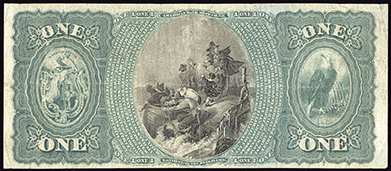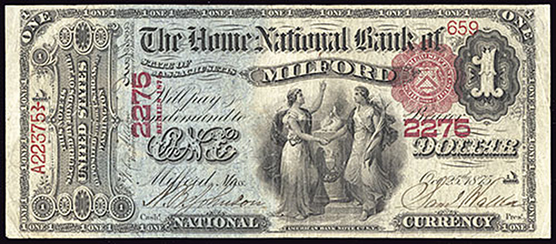 MA. Millford. Ch.2275. Home National Bank of Millford. $1. 1875. Fr. 383. No.659/A22375. Plate A. F-VF. The second quarter panel from the left is blue with numerous small threads in the paper, as if it was made on the same paper as the 1869 "Rainbow" Legal Tenders.