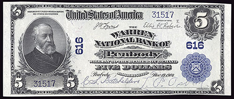 MA. Peabody. Ch.616. Warren National Bank of Peabody. $5. 1902 PB. Fr. 598. No.31517. Plate E. AU, and it looks to be Uncirculated at first glance. By far the nicest 1902 Plain Back on this second title.