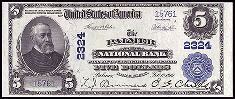 MA. Palmer. Ch.2324. Palmer National Bank. $5. 1902 PB. Fr. 606. No.15761/15761. Plate A. Uncirculated. Fresh, and crisp, with bold printed signatures.