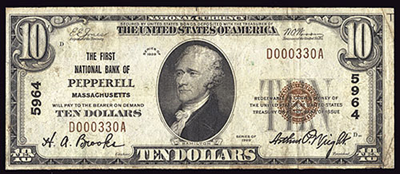MA. Pepperell. Ch.5964. First National Bank of Pepperell. $10. 1929 T1. Fr. 1801-1. No.D000330A. Plate D. VF, lightly soiled on the back.