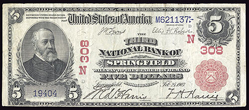 MA. Springfield. Ch.N308. Third National Bank of Springfield. $5. 1902 RS. Fr. 587. No.19404/M621137. Plate D. VF.