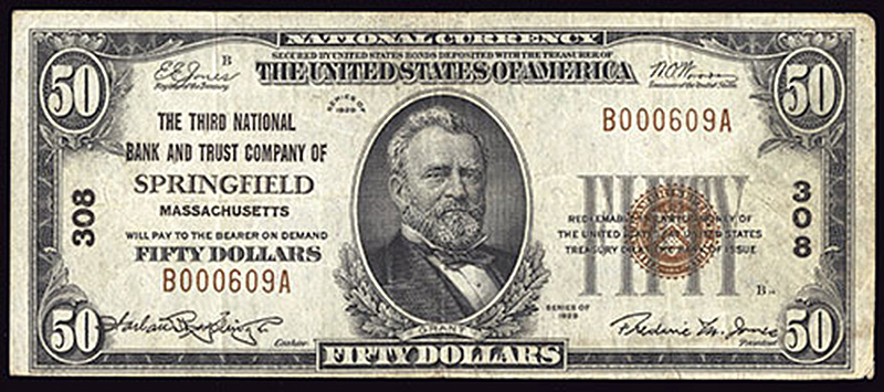 MA. Springfield. Ch.308. Third National Bank and Trust Company of Springfield. $50. 1929 T1. Fr. 1803-1. No.B000609A. Plate B. F-VF.