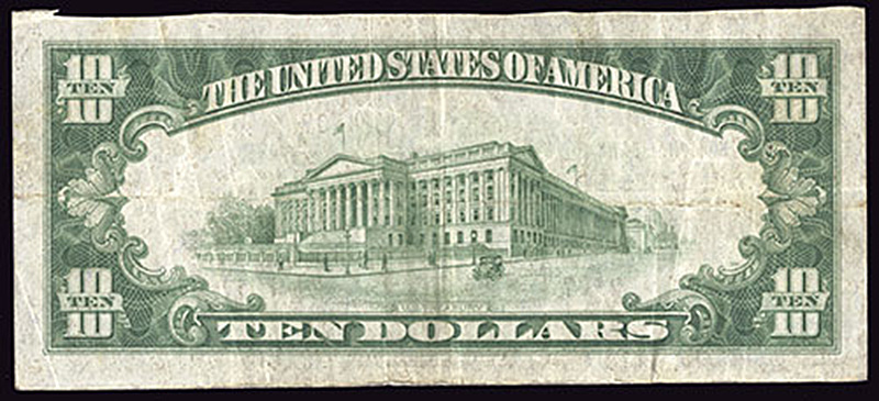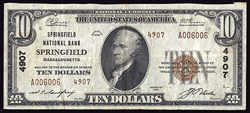 MA. Springfield. Ch.4907. Springfield National Bank. $10. 1929 T2. Fr. 1801-2. No.A006006. Plate L. VF.
