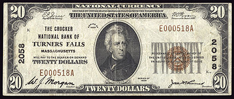 MA. Turners Falls. Ch.2058. Crocker National Bank of Turners Falls. $20. 1929 T1. Fr. 1802-1. No.E000518A. Plate K. F-VF.