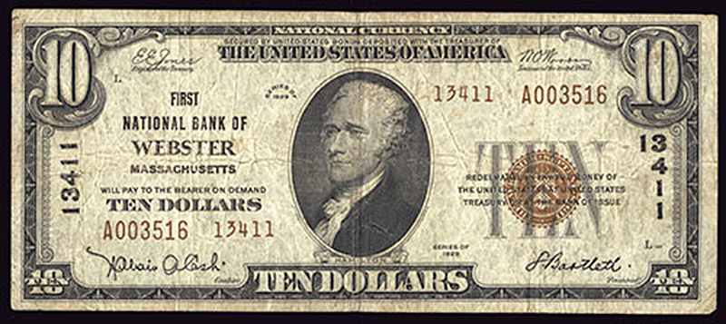 MA. Webster. Ch.13411. The First National Bank of Webster. $10. 1929 T2. Fr. 1801-2. No.A003516. Plate L. Fine.