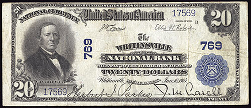 This is only the ninth large size note reported on the bank, and only the second $20 denomination known. The last time a large size National on this Worcester County bank appeared at auction was in 1999. Acquired from Curt Iversen in 1976.