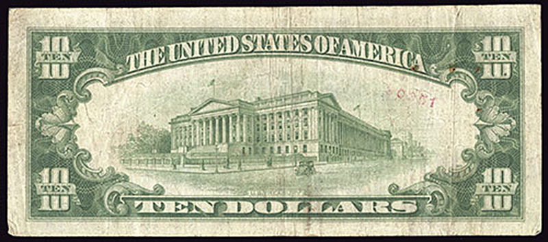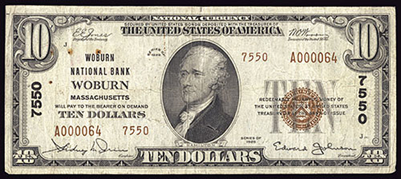 MA. Woburn. Ch.7550. Woburn National Bank. $10. 1929 T2. Fr. 1801-2. No.A000064. Plate J. About Fine details but there are pinholes, and some small rust stains present.