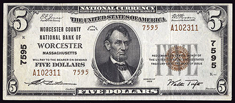 MA. Worcester. Ch.7595. Worcester County National Bank of Worcester. $5. 1929 T2. Fr. 1800-2. No.A102311. Plate K. VF-EF.