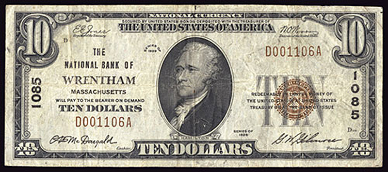 MA. Wrentham. Ch.1085. National Bank of Wrentham. $10. 1929 T1. Fr. 1801-1. No.D001106A. Plate D. F-VF.