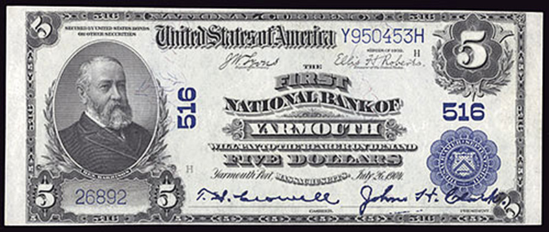 MA. Yarmouth. Ch.516. First National Bank of Yarmouth. $5. 1902 PB. Fr. 598. No.26892/Y950453H. Plate H. EF, but this note has the appearance of an Uncirculated example.