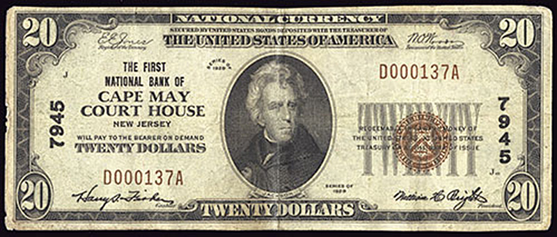 NJ. Cape May. Ch.7945. First National Bank of Cape May Court House. $20. 1929 T1. Fr. 1802-1. No.D000137A. Plate J. VF detail, but the corners are rounded.