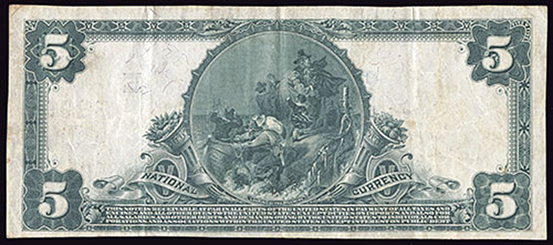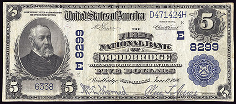 NJ. Woodbridge. Ch.E8299. First National Bank of Woodbridge. $5. 1902 PB. Fr. 600. No.6338/D47142H. Plate E. VF-EF detail but there is a small tear on the right side. An Uncirculated example brought $2,820 in a Heritage auction early in 2013, and that is the only recent price indication readily available.