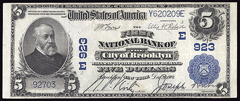 NY. City of Brooklyn. Ch.E923. First National Bank of the City of Brooklyn. $5. 1902 PB. Fr. 598. No.92703/Y620209E. Plate J. VF. High grade for this issue. A similar note brought $488 in Lyn Knight's March 2013 sale.