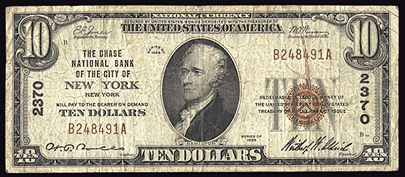 NY. New York. Ch.2370. Chase National Bank of the City of New York. $10. 1929 T1. Fr. 1801-1. No.B248491A. Plate B. Fine.