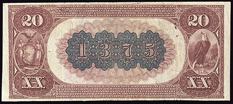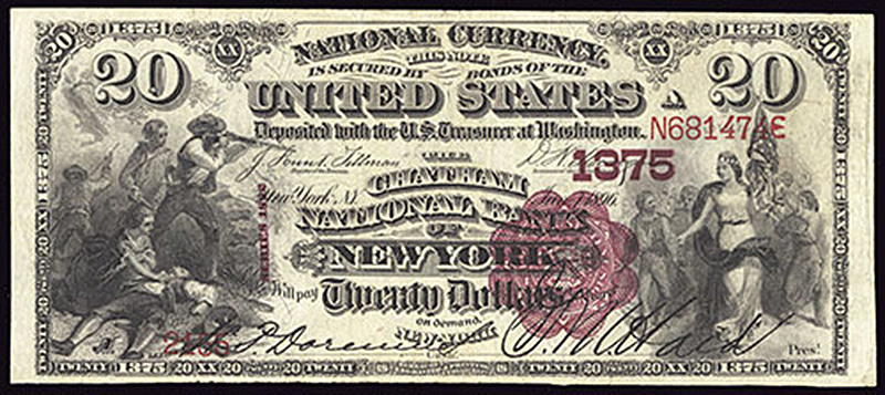 NY. New York. Ch.1375. Chatham National Bank of New York. $20. 1882 BB. Fr. 501. No.N681474. Plate A. VF. There are two small stains on the back, mentioned for the sake of accuracy.