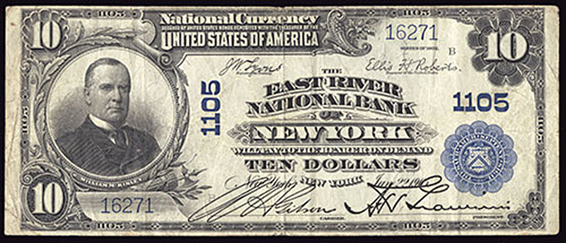 NY. New York. Ch.1105. East River National Bank of New York. $10. 1902 PB. Fr. 624. No.16271. Plate B. VF. There is an edge split into the top center margin; otherwise quite attractive.