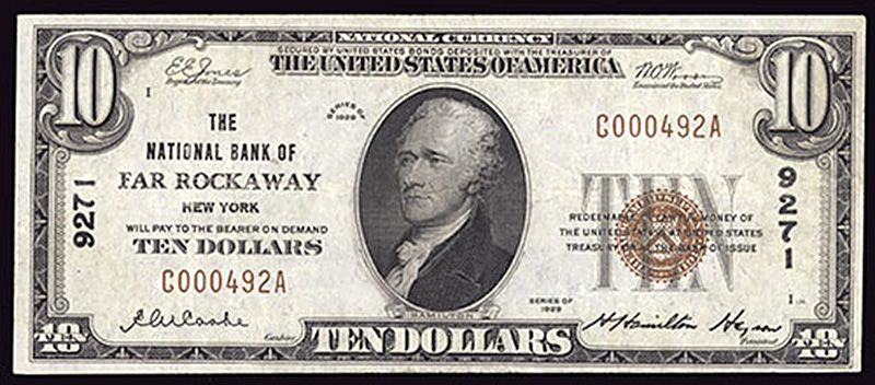 NY. Far Rockaway. Ch.9271. National Bank of Far Rockaway. $10. 1929 T1. Fr. 1801-1. No.C000492A. Plate I. VF. A very nice example of this popular Queens County note.