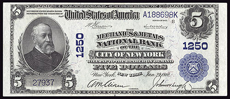 NY. New York. Ch.1250. Mechanics and Metals National Bank of the City of New York. $5. 1902 PB. Fr. 601. No.27937/A188698K. Plate B. EF-AU. A nicely centered note; bright and appealing.