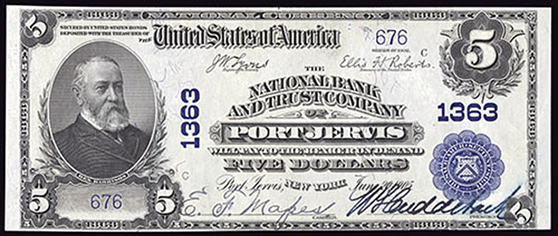 NY. Port Jervis. Ch.1363. National Bank and Trust Company of Port Jervis. $5. 1902 PB. Fr. 598. No.676. Plate C. Uncirculated. Some light teller handling is apparent, but this example is very bright and fresh. A popular New York title.
