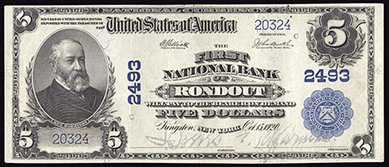 NY. Rondout. Ch.2493. First National Bank of Rondout. $5. 1902 PB. Fr. 607. No.20324. Plate C. VF-EF. Crisp for the grade, and retaining some of the original embossing.