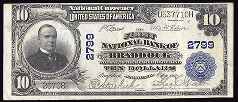 PA. Braddock. Ch.2799. First National Bank of Braddock. $10. 1902 PB. Fr. 624. No.20708/U537710H. Plate E. VF-EF, with some moderate fold soiling on the back.