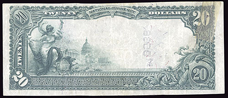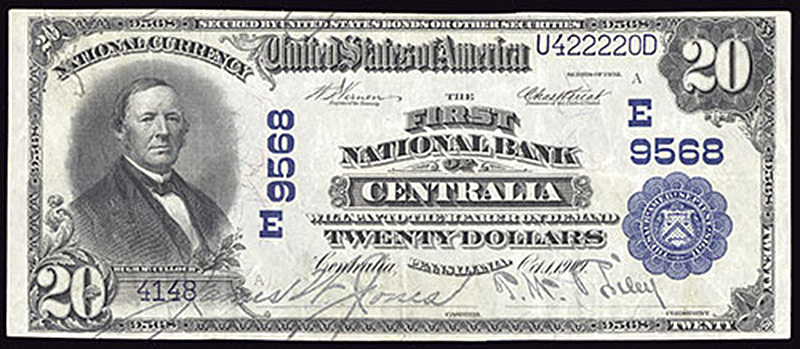 PA. Centralia. Ch.E9568. First National Bank of Centralia. $20. 1902 PB. Fr. 652. No.4148/U422220D. Plate A. VF detail, but there is a taped tear.